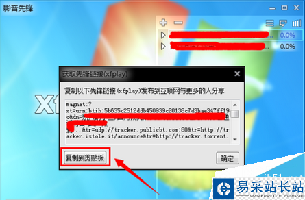 從彈出的”獲取xfplay磁鏈“窗口中點擊”復制到剪貼板“按鈕,以便復制磁鏈至剪貼板。