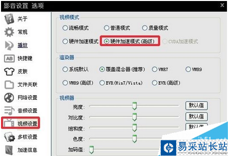 設置窗口的視頻設置窗口,我們這里選擇視頻模式為硬件加速模式。