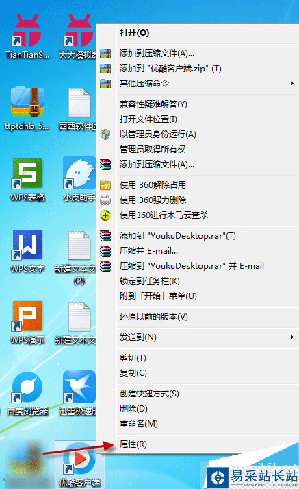 1、在桌面上的優(yōu)酷客戶端單擊右鍵,出現(xiàn)快捷菜單,單擊左鍵選擇“屬性”