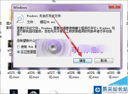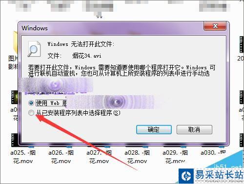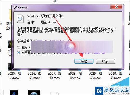 3、當在這個avi視頻上面雙擊打開后,它會彈出這樣一個提示:無法打開些文件。這時,點擊下面的從已安裝程序列表中選擇程序。然后點擊確定。