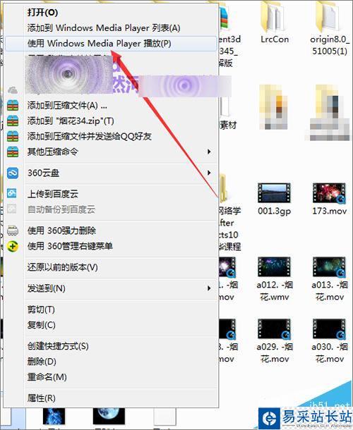 2、在它的縮略圖上面點擊右鍵,選擇系統(tǒng)自帶的windows media player進行播放的時候,是可以進行正常的播放。就是縮略圖會顯示出白色。