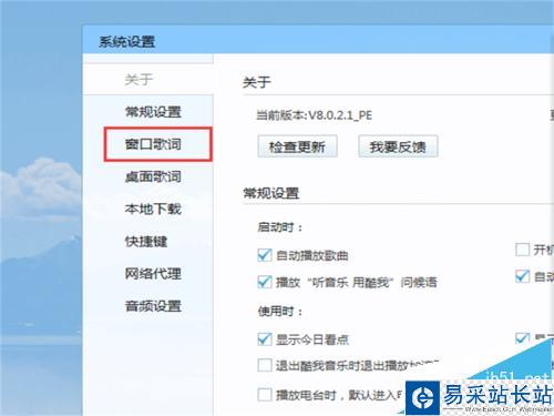 3、點擊按鈕以后,會彈出一個下拉菜單,點擊菜單中的【設置】字樣按鈕,然后就進入到【系統設置】頁面,在系統設置頁面中,點擊左側菜單中的【窗口歌詞】字樣的按鈕。