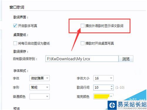 4、然后在【播放外語歌時顯示譯文歌詞】前面畫勾,就可以了,以后你再用酷我音樂播放外文歌曲的時候,它就會顯示中文歌詞。