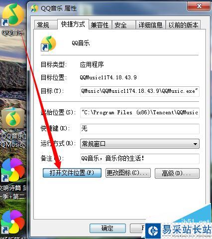 1、桌面QQ音樂圖標>>右鍵單擊 - 屬性 - 打開所在位置