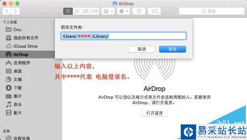 4、按提示輸入“/Users/****/Library/”內容,同時將“****”用你的電腦登錄名替換掉,選擇“前往”。