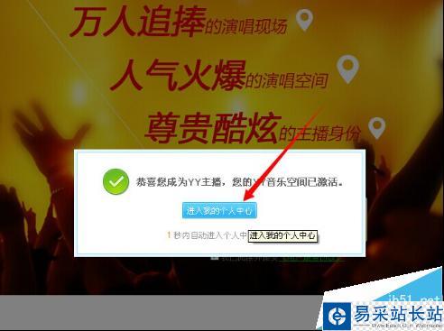 1、在“音樂個人中心”-“我的申請”頁面,YY直播間一欄右側點擊“申請成為主播”注冊后登錄→點擊個人中心
