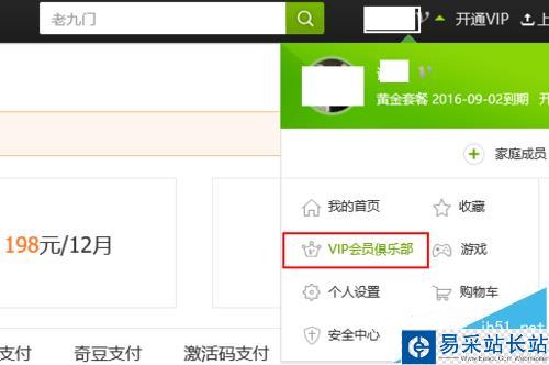 5、如果是首次使用愛奇藝的會員的話,進入這個購買頁面以后,在右上角的賬號旁的小三角點擊,選擇vip會員俱樂部