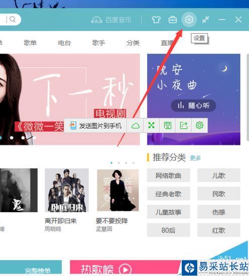 2、在打開的百度音樂程序窗口,點擊工具欄中的“設置”按鈕圖標。如圖所示;