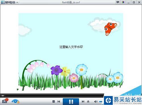 5、OK,瞬間保存好swf動(dòng)畫加水印后的新SWF文件,找到它并播放預(yù)覽看看,如下圖,在畫面中間已經(jīng)出來的添加的水印文字了。