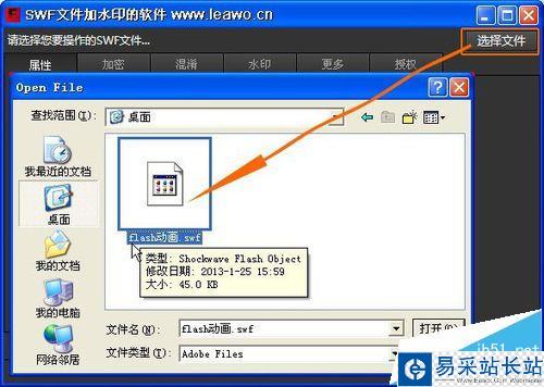 2、打開swf文件加水印的軟件,如下圖,點(diǎn)擊右上方的“選擇文件”按鈕,將要操作的本地電腦中的“flash動(dòng)畫.swf”文件“打開”。