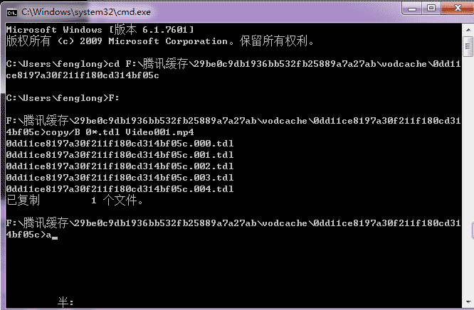 (在“copy/B”和“0*.tdl”之間有一個(gè)空格,“0*.tdl”和“Video001.mp4”之間也有一個(gè)空格。其中0是文件中的第一個(gè)字母,如果大家的文件以“a”開(kāi)頭的話,那么命令應(yīng)該寫(xiě)為“copy/B a*.tdl Video001.mp4”。)