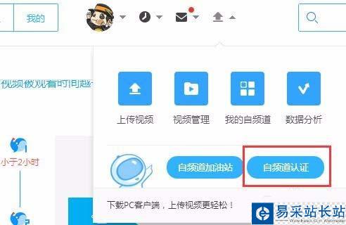 3、如果你的優(yōu)酷空間等級(jí)已經(jīng)達(dá)到了3級(jí),那么你就可以進(jìn)行個(gè)人認(rèn)證了,在頭像的右側(cè),如圖中所示,選擇“自頻道認(rèn)證”