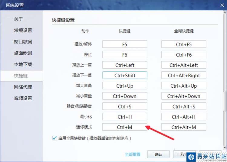 2、在彈出來的對話框中點擊【快捷鍵】,查看是否在【使用全局快捷鍵】前打鉤,然后點擊確定,試一下是否能在后臺進行控制。