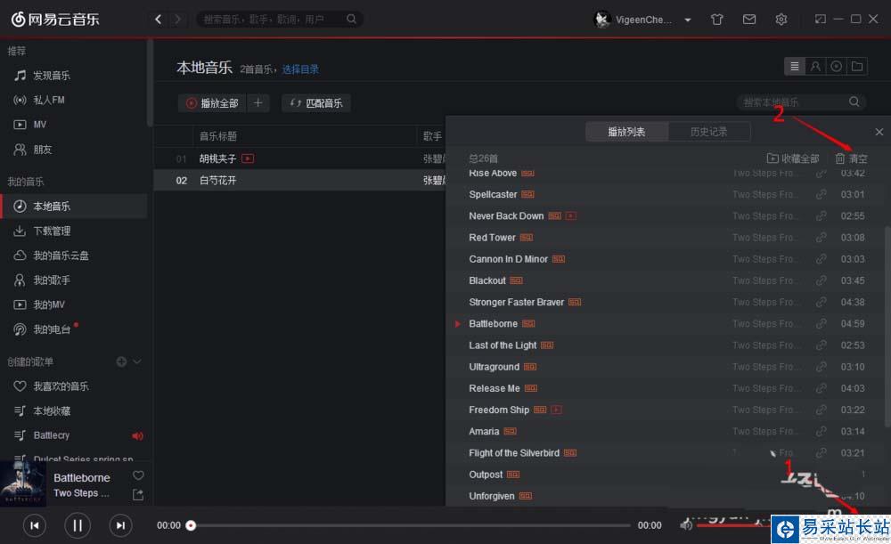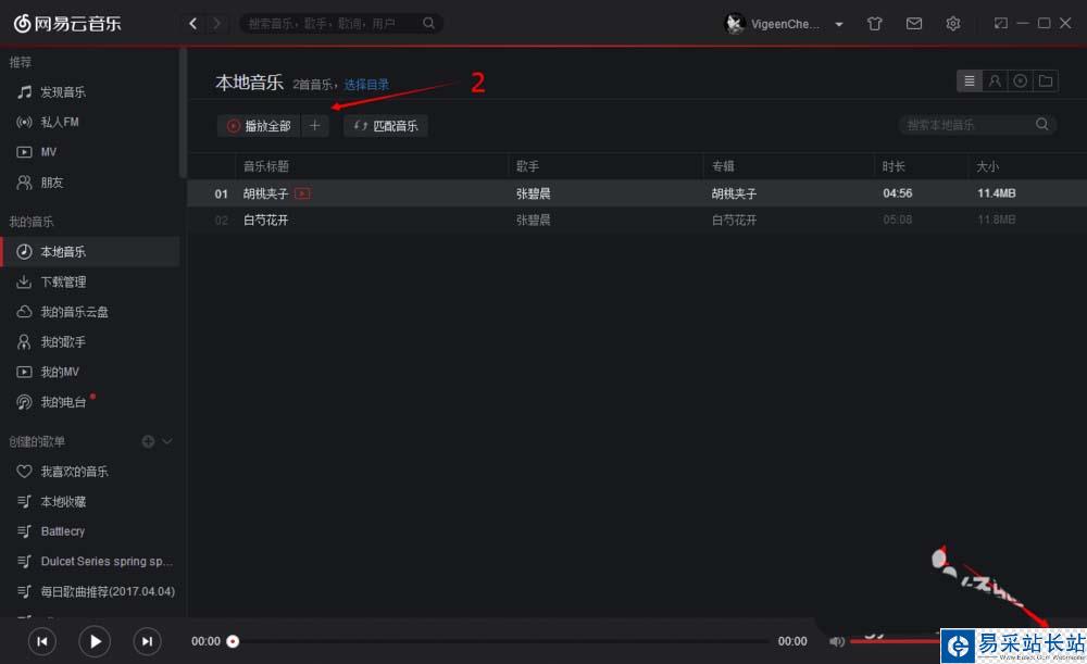 4、我這邊舉例的是兩首張碧晨的歌曲,這兩首歌曲都是320kps,當(dāng)我購(gòu)買了網(wǎng)易云會(huì)員后,我希望把這兩首歌曲都提升可以下載的無損音質(zhì)。我們先確保當(dāng)前右下角的播放隊(duì)列沒有歌曲,因?yàn)槲覀冃枰獙⒃摳枨砑拥讲シ抨?duì)列,如果沒歌曲直接點(diǎn)擊上面“播放全部”旁邊的加號(hào),否則先清空播放隊(duì)列,再添加。添加歌曲到播放隊(duì)列后,歌曲便會(huì)馬上播放,我們同時(shí)也看到右下角有添加成功的提示。