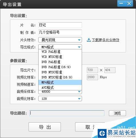 軟件支持導出AVI、MP4等格式,點擊視頻預覽框右下角的“導出視頻”按鈕,在“導出格式”下拉框中即可選擇。根據需要和原片清晰度,設置“視頻比特率”,來調節視頻清晰度,數值越大,清晰度越高。最后快速導出高清視頻即可。