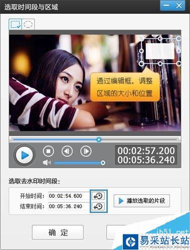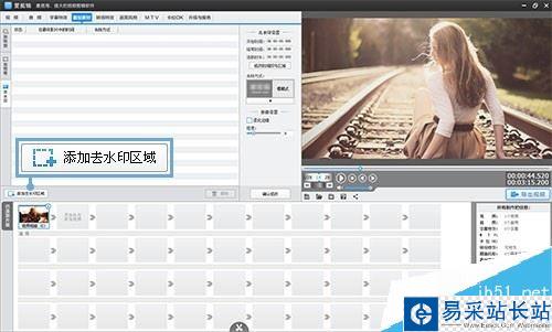 在“疊加素材”選項卡左欄“去水印”,點擊“添加去水印區域”按鈕,即可為當前片段或整個視頻去除水印。在界面中央“參數設置”欄目,勾選“柔化邊緣”,向右拉動“程度”下方的滑桿,可以優化去水印的效果~