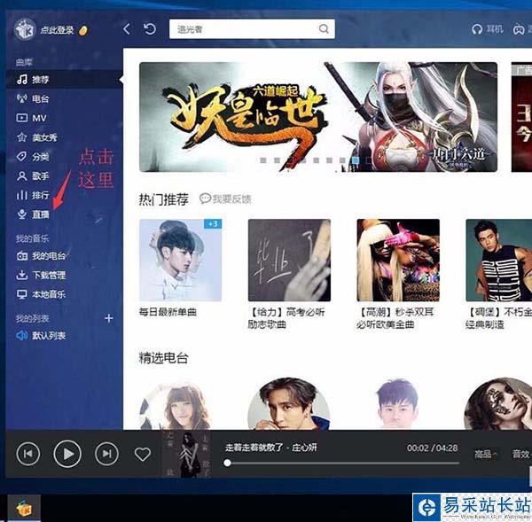 2、酷我最上面有“直播”兩字,然后點擊“直播”,如圖所示
