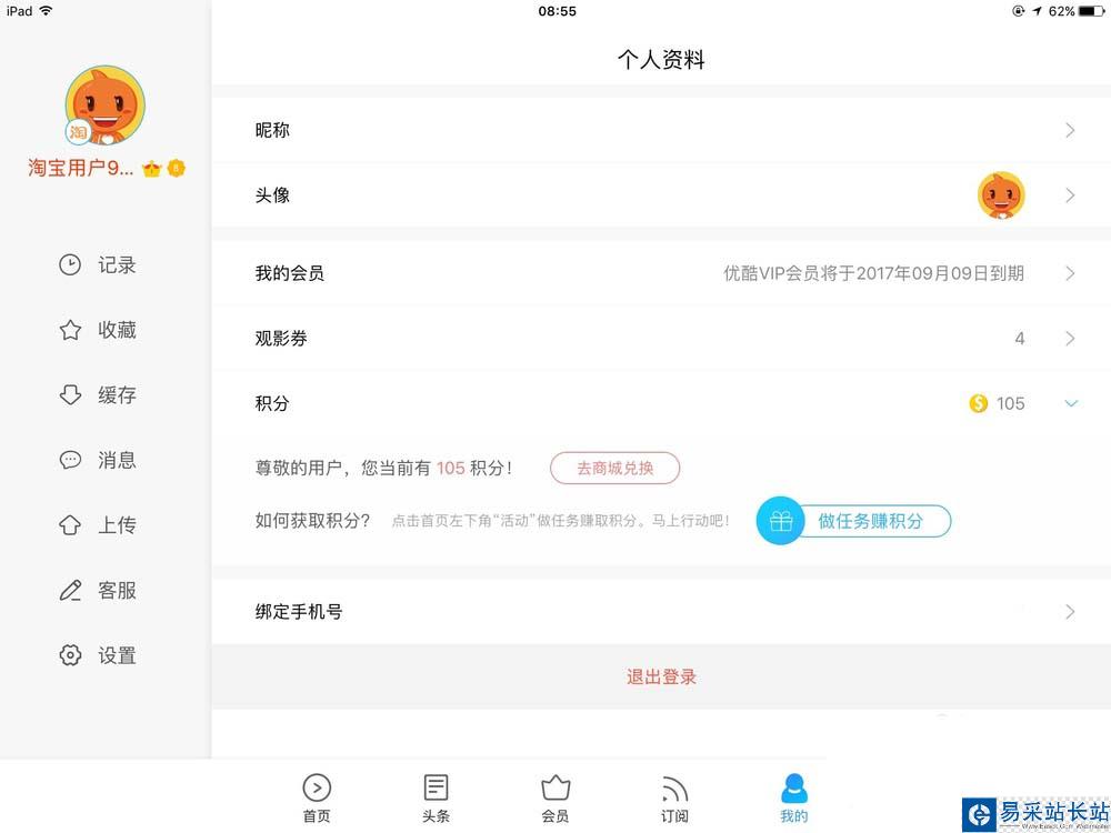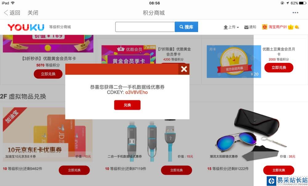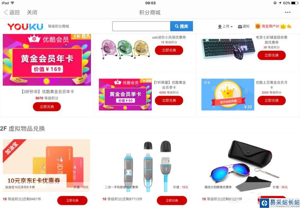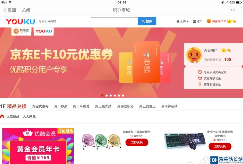 5、點(diǎn)擊‘去商城兌換’,會出現(xiàn)優(yōu)酷積分商城