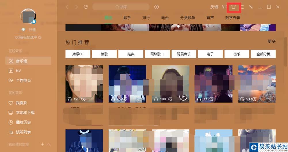 2、打開qq音樂的主窗口之后,點擊右上角的衣服圖標,進入皮膚設置。