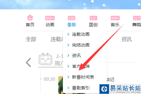 2、我們進入B站,點擊如圖所示的“番劇”,一般來說都是追新番,承包新番,所以我們這里點擊新番時間表。