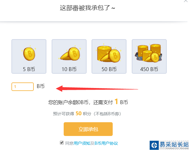 5、在如圖所示的位置可以自定義承包的金額,最低是1B幣。
