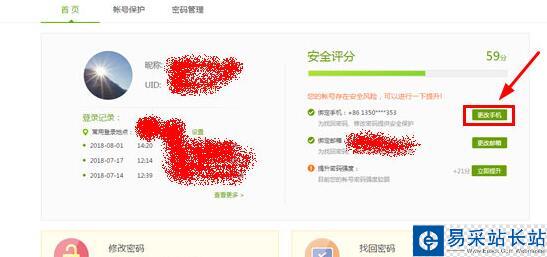 3、在此頁(yè)面可以看到自己個(gè)人信息和安全評(píng)分,我們不管其他的內(nèi)容,點(diǎn)擊紅框標(biāo)注的“更改手機(jī)”選項(xiàng),如下圖: