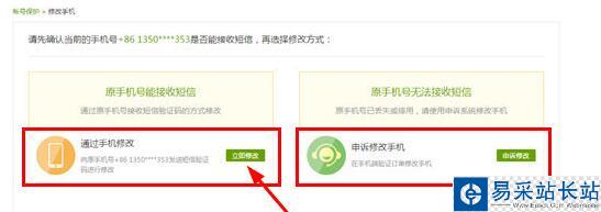 4、重點(diǎn)的來(lái)了,現(xiàn)在界面中可以選擇兩種修改手機(jī)的方式,分別是“通過(guò)手機(jī)修改”和“申訴修改手機(jī)”兩種選項(xiàng),主要是根據(jù)用戶是否能用原手機(jī)進(jìn)行解綁手機(jī)號(hào),在這里選擇手機(jī)修改,點(diǎn)擊跳轉(zhuǎn)到更改手機(jī)驗(yàn)證界面,如下圖: