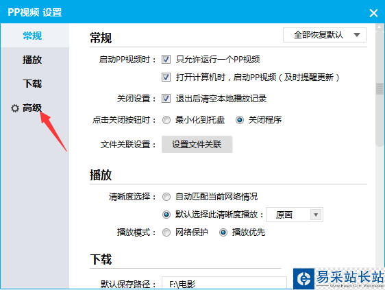 3、選中了設(shè)置的選項之后,彈出了pp視頻設(shè)置的選項,選中高級的選項。