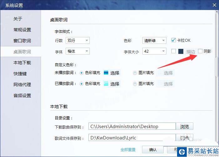 6、在右側(cè)的對應(yīng)桌面歌詞設(shè)置區(qū)域,我們找到并設(shè)置桌面歌詞不為陰影形式,如圖所示。