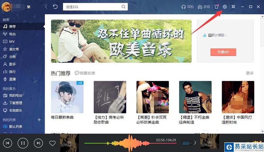 2、在這個酷我音樂當(dāng)中,我們點擊右側(cè)上方的箭頭所指位置,如圖所示。