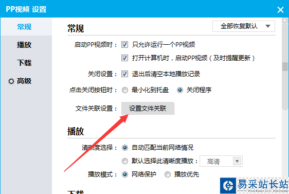 4、就會彈出了一個pp視頻設置窗口界面當中,選中常規選項,設置點擊文件關聯設置,點擊設置文件關聯按鈕。