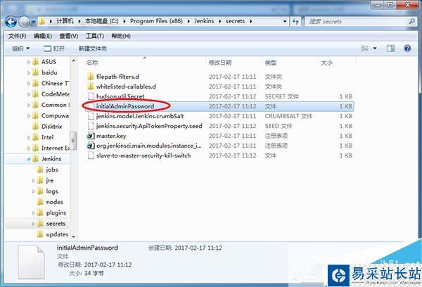 4、找到軟件根目錄下(默認目錄為:C:/Program Files (x86)/Jenkins)secrets文件夾下的initialAdminPassword文件,使用記事本打開,如下圖所示: