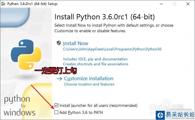 下載好Python的安裝程序后,開始安裝,在進(jìn)入安裝界面后一定確保勾選將Python加入到系統(tǒng)環(huán)境變量的路徑里。如圖所示: