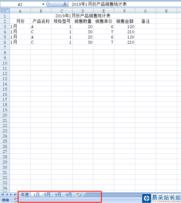 Sub 一表分多表()For i = 1 To 4 Worksheets.Add.Name = i & "月" Sheets(i & "月").Move after:=Sheets(Sheets.Count) Set rg = Sheets("年度").Cells(Rows.Count, 1).End(xlUp) For Each Rng In Sheets("年度").Range(Sheets("年度").[a3], rg) If Rng = i & "月" Then k = k + 1 If k = 1 Then Sheets("年度").[a1:g2].Copy Sheets(i & "月").Range("a1") Sheets(i & "月").[a1] = "2019年" & i & "月份產(chǎn)品銷售統(tǒng)計(jì)表" End If Rng.Resize(, 6).Copy Sheets(i & "月").Range("a" & k + 2) End If Next Rng k = 0Next iEnd Sub