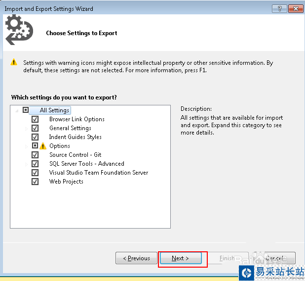 3、然后選擇需要導(dǎo)出的配置,可以全選,如圖,點擊“next”