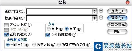 1.選擇“搜索”菜單的“替換”命令,出現(xiàn)如圖所示的文本替換對(duì)話框。選中“正則表達(dá)式”復(fù)選框,表明我們要在查找、替換中使用正則表達(dá)式。然后,選中“全部替換范圍”中的“當(dāng)前文件”,表明對(duì)當(dāng)前文件操作。(提示:可以同時(shí)打開多個(gè)文件進(jìn)行操作,只要選中“所有打開的文件”)。
