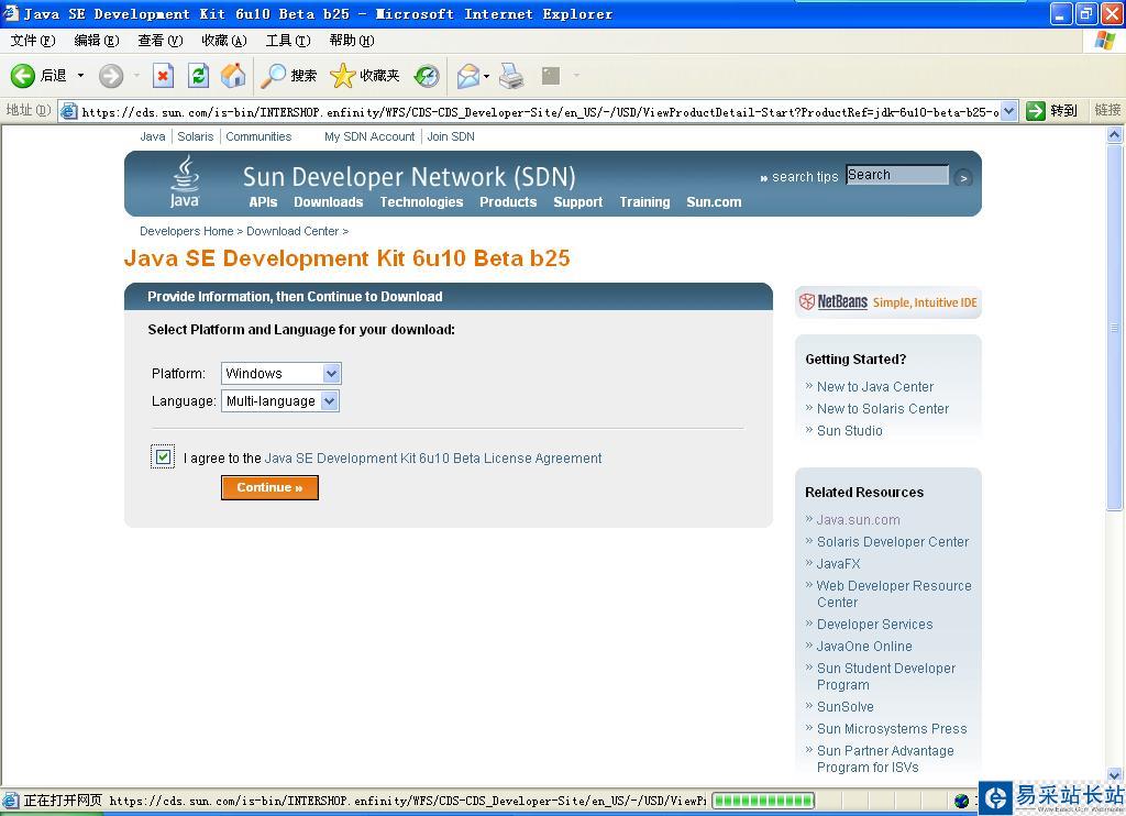 進入了下載選項,我們的操作平臺是Windows XP,鉤選上協(xié)議,按continue繼續(xù)下一步。