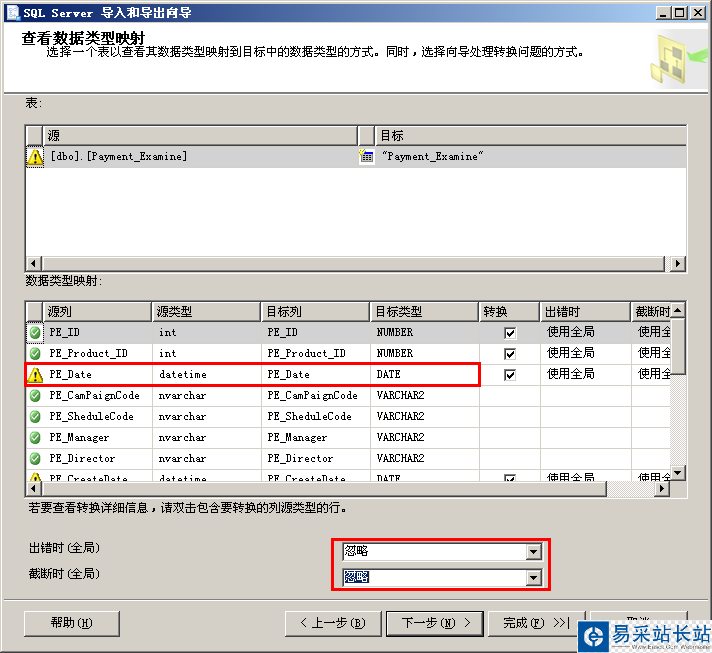 5.這里的datetime轉成date是有警告的,不過沒關系,然后可以忽略出錯與截斷,下一步: