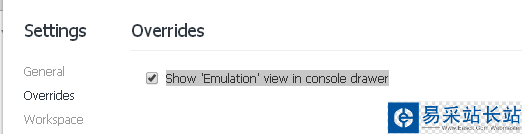 4:自帶模擬器*打開chrome開發者工具,按F12(r32版本),然后找到右上角的齒輪按鈕,打開設置面板,選擇Overrides,勾上Show ‘Emulation’ view in console drawer(在控制臺視圖中顯示“仿真”)。