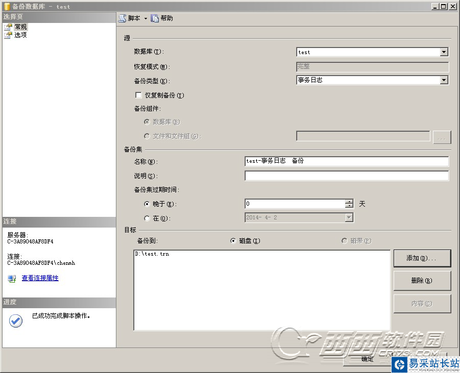 BACKUP LOG [test] TO DISK = N'D:/test.trn' WITH NOFORMAT, INIT, NAME = N'test-事務(wù)日志 備份', SKIP, NOREWIND, NOUNLOAD, STATS = 10GO