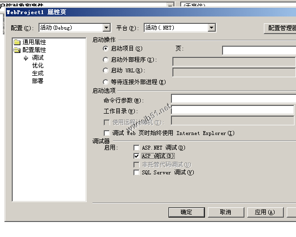 點項文件欄上的“項目”,然后點“webproject1屬性”--“配置屬性”--“調試”里,把“asp.net調試”去掉,把“ASP”調試打開。