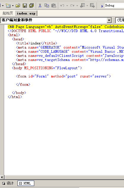 右鍵webproject1,添加新項---WEB窗體,名稱叫index.asp(注意名稱不是aspx,是asp)。然后可以看到index.asp的HTML處理編輯狀態。