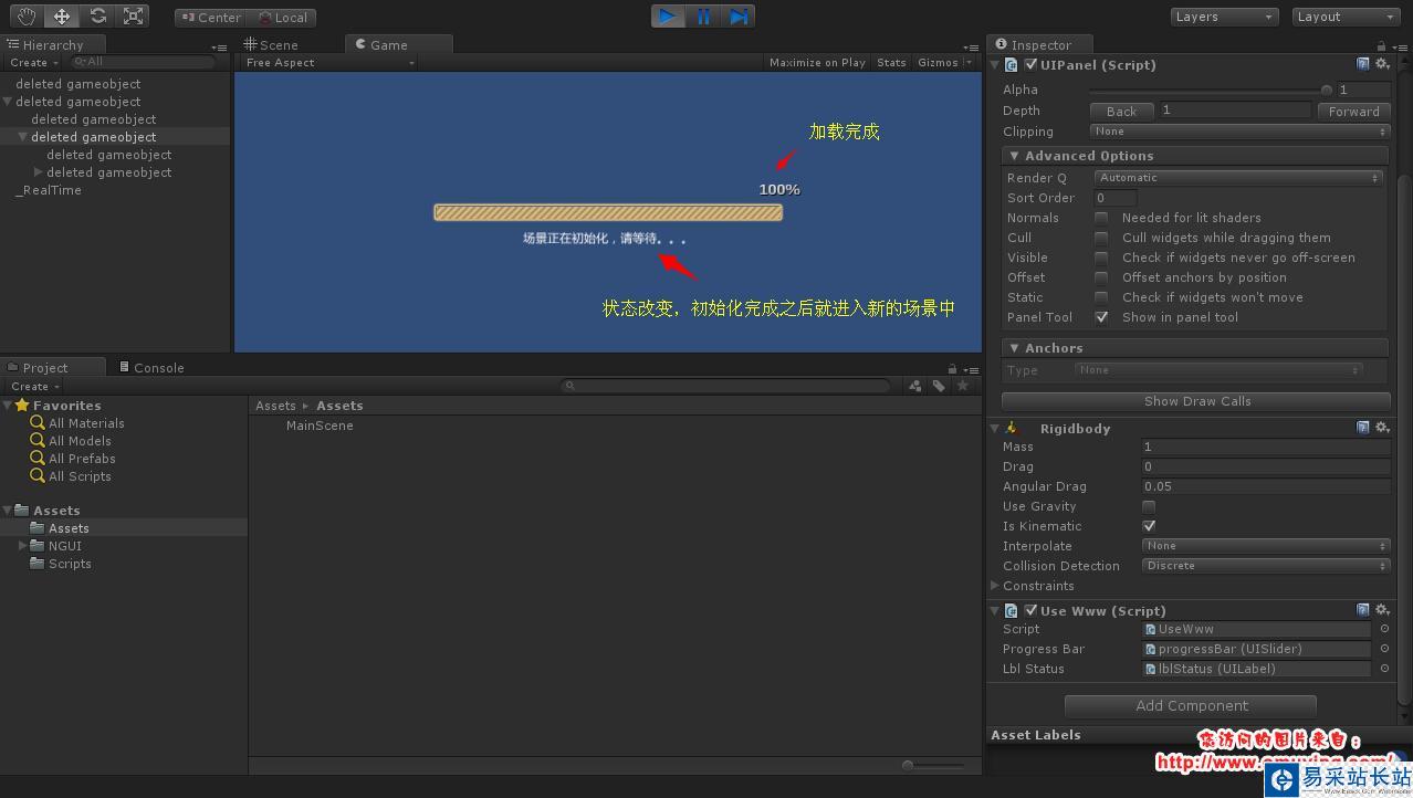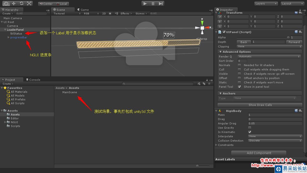 Unity3D 加載場景有很多種方式,做一些小的 DEMO 的時候往往是直接使用 Application.LoadLevel 或者 Application.LoadLevelAsync 函數加載場景,具體可查看(http://www.xuanyusong.com/archives/1427),但是這種辦法不適合在真正的 Unity3D 開發中,因為前一種需要把所有的場景都打包,這在某些情況下是不現實的,比如開發頁游,我們不可能把所有的場景都打包讓用戶下載,我們需要一個場景一個場景的加載,這時候我們可以使用 WWW 先通過 HTTP 加載場景到本地緩存,然后再使用 Application.LoadLevel 或者 Application.LoadLevelAsync 函數加載場景,使用這種加載方式,不僅不需要 Build Settings -> Add Current 處理加載場景,進度條的顯示也更加容易,但是使用這種方式,需要先把場景打包成 unity3d(查看詳情) 或者 assetbundle(查看詳情) 文件。