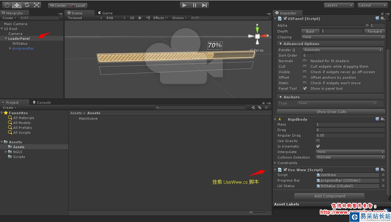 然后添加一個 C# 腳本,取名 UseWww.cs,全部代碼如下: