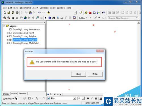 3、這是會彈出一個框,提示你想不想把導出的數據作為這個地圖的一個圖層,點擊“是”會立刻添加到圖層,否側反之;也可以自己手動加載進去,轉了都是需要的,一般都會單擊“是”。