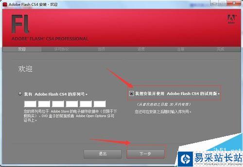 2、進入歡迎界面,選擇“我想安裝并使用 Adobe Flash CS4的試用版”,然后點擊“下一步”,如下圖所示: