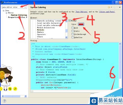 3、在右側(cè)的Elements中選擇相應(yīng)原色。勾選Enable之后就可以調(diào)整顏色了,下面的Bold為粗,Italic 斜體 Underline為下劃線,Strikethrough 為貫穿線 ,下方的Preview可以查看修改效果