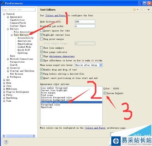 2、這次還是General 不過(guò)是在Editors下面找Text Editors ,這里注意觀察右邊出來(lái)的Background color (如果沒有 兩個(gè)原因 一是版本問(wèn)題 二是選擇了Text Editors 下面的子選項(xiàng))