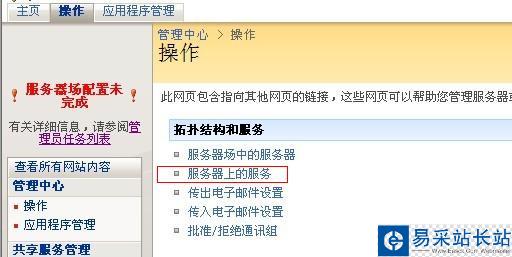 我們進入SharePoint的管理中心,進入操作界面,選擇“服務器上的服務”: