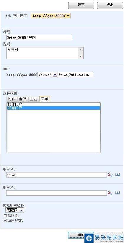 點擊“創建網站集”進入創建網站集的管理界面,SharePoint為我們提供了很多網站類型的模板,如發布網站,會議工作區....。根據自己的需求,選擇合適的網站類型。這里我們以發布門戶網站為例,進行網站配置: